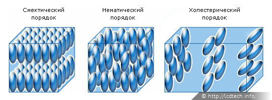 Согласно классификации Фриделя, различают три основные категории порядка ЖК: смектический, нематический и холестерический (см. рис. 1).