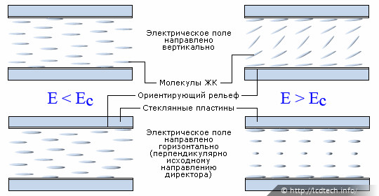 Пока поле достаточно слабое, силы упругости удерживают молекулы в неизменном положении. При увеличении напряжения, начиная с некоторого значения Ec, ориентационные силы электрического поля превышают силы упругости, и начинает происходить поворот молекул.