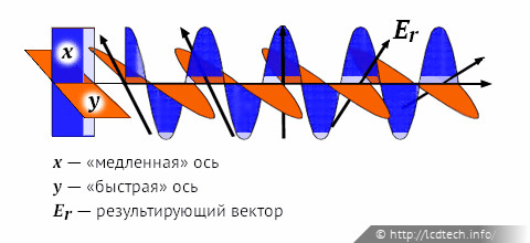 Таким образом, сложение волн на выходе из двулучепреломляющего материала даст волну с измененным относительно исходного направлением поляризации.