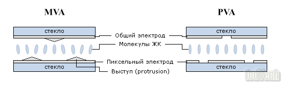 MVA отличается наличием микроскопических продольных выступов (protrusion) для преднаклона молекул на верхней, либо на обеих подложках, поэтому исходное вертикальное выравнивание не является полным.