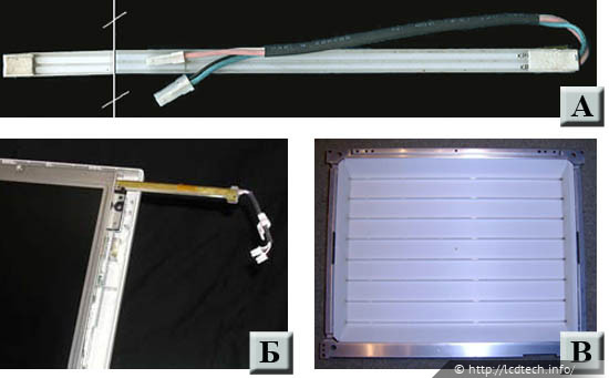 Рис. 13. А — блок из двух CCFL-ламп; Б — в панелях с торцевым расположением ламп для их извлечения предназначены технологические отверстия; В — модуль подсветки с расположением ламп по задней поверхности ЖК-панели