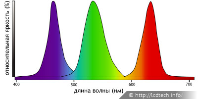 Спектр модуля подсветки на базе пакета RGB-LED. Иллюстрация построена на базе изображения из документа « LCD2180WG.LEDTechPaper».