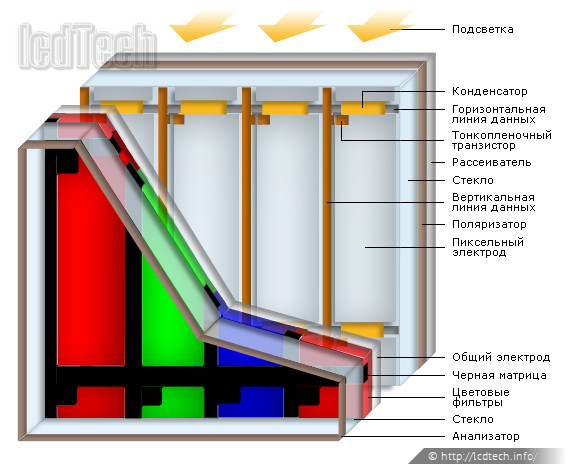 Существует несколько технологий ЖК-панелей. Для иллюстрации конструкции в данном случае приведена TN, как наиболее распространенная (рис.6).