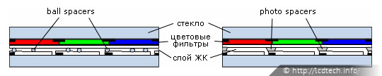 Расстояние между верхней и нижней пластиной и, соответственно, толщина слоя жидких кристаллов составляет несколько микрон.