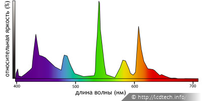 Спектр CCFL крайне неровный, в нем присутствуют ярко выраженные узкие пики.