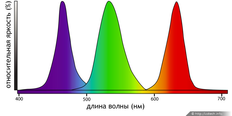 Спектр модуля подсветки на базе пакета RGB-LED. Иллюстрация построена на базе изображения из документа « LCD2180WG.LEDTechPaper».